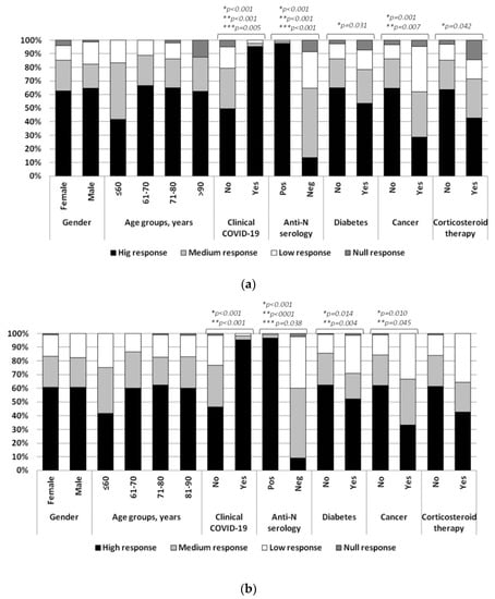 In contrast, corticosteroid administration and diabetes reduced all levels of specific antibodies. However, significant associations were observed only when considering all levels of response. Residents with neoplastic disease showed a significant difference in the distribution of the IgG–S titers considering all levels and the suboptimal response, but not the null response (38.1% vs. 13.9%) (Figure 1a).