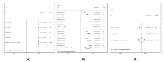 Forest plots of AEs in observational studies. (A) Forest plot of viral vector vaccine; (B) forest plot of AEs of mRNA vaccine in observational study; (C) forest plot of inactivated vaccine in observational study.