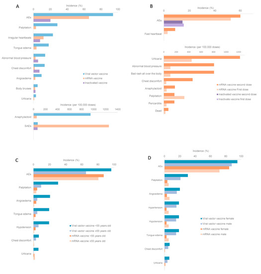 The incidence of adverse events (AEs) of different vaccines and population. (A) The incidence of AEs of different vaccines; (B) the incidence of dose-specific AEs with mRNA vaccine or inactivated vaccine inoculation; (C) the incidence of age-specific AEs with viral vector vaccine or mRNA vaccine inoculation; and (D) the incidence of gender-specific AEs with inactivated vaccine inoculation.