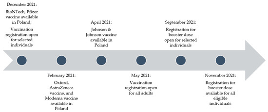 From late December 2021, it was possible for health workers to register for the administration of BioNTech, the Pfizer vaccine. In the following months, registration options were extended to teachers, the uniformed services, selected age groups (starting with the oldest and successively including younger ones), and immunocompromised individuals (people with MS being treated with DMTs were not included). The Oxford, AstraZeneca vaccine and Moderna vaccine were available in Poland, with a slight delay, from February 2021. The first doses of Johnson & Johnson vaccines were included in the vaccination program from April 2021. The availability of different vaccine types varied among vaccination centers, especially during the first months of the national immunization program. In May 2021, it was possible for all adult persons to register for vaccination against COVID-19. A booster dose after the first full course of vaccination was available in Poland for the general population (including patients with MS) from November 2021. At the time of conducting the survey, the additional dose was recommended, but this was not included in the analysis as the time of observation was short. The basic timeline of vaccine availability in Poland is shown in Figure 1 [13].