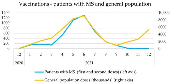 Individuals diagnosed with MS according to the 2010 and 2017 McDonald criteria were included, and most of them were being treated with DMTs. The patients’ levels of disability were assessed using the Expanded Disability Status Scale (EDSS) [11]. Patient demographics data and the characteristics of MS were collected, which included the duration of the disease, the level of disability, current DMT use, information about vaccination against SARS-CoV-2 (type of vaccination, number of doses), the presence of adverse events following vaccination (time of onset and resolution, type and severity of symptoms, treatment used), and information regarding the occurrence of relapses after immunization or worsening of MS symptomatology (pseudo-relapse). The minimum observation time was 21 days. Gathered data included information about the number of doses (one or two) of different vaccines. The additional data about COVID-19 cases in the Polish population were obtained from official reports of the Polish Ministry of Health [12].