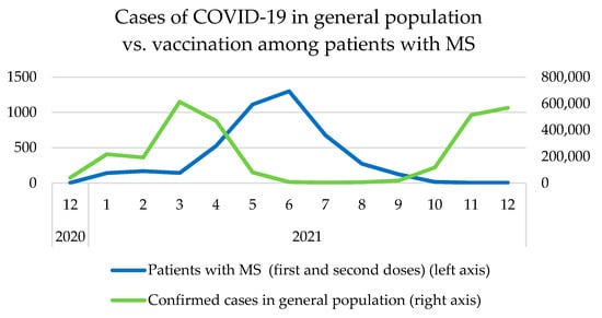 COVID-19 vaccination frequency among individuals with MS, in correlation with the confirmed cases in Poland.