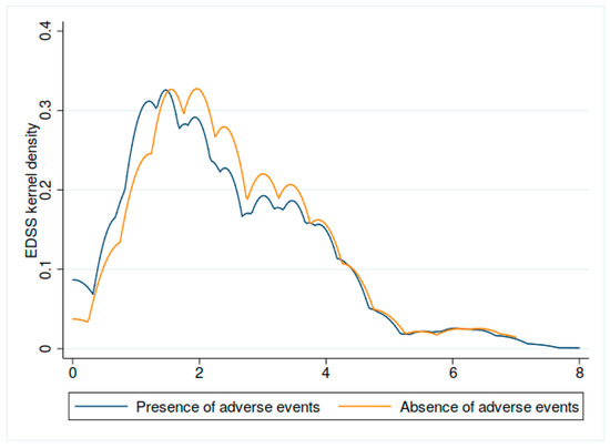 The value of EDSS among individuals with adverse events was lower in comparison to patients without side effects. However, the difference is close to the significance threshold and should be interpreted with caution (p = 0.049). Figure 4 shows the kernel density plot of EDSS distribution in the case of adverse events.