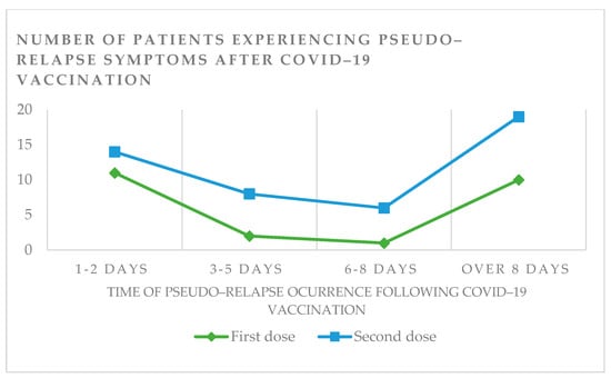 A temporary onset of worsening neurologic symptoms without clinical progression of the disease (pseudo-relapse) after vaccination was observed in 62 (2.7%) individuals. Those patients did not fulfill the criteria for relapse. Pseudo-relapse was present in 20 patients after the first dose and in 43 patients after the second dose. One individual had pseudo-relapse symptoms after receiving the first and second doses. In most cases, the symptoms appeared 1–2 days or over 8 days after the vaccination (regardless of the dose) (Figure 5).