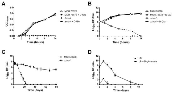 Growth and viability of K. pneumoniae MGH 78578 and its murI-deficient mutant were determined as previously described [29]. Samples were taken at different times to measure the culture turbidity (optical density at 600 nm, OD600) and to determine the colony-forming units (CFUs) on LB agar supplemented or not with 10 mM D-glutamate. All cultures were prepared in triplicate.