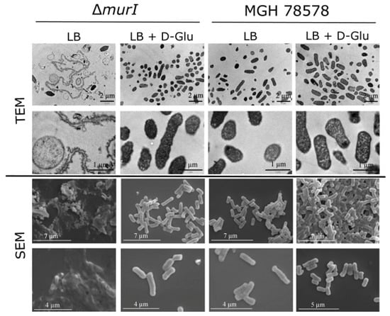 Morphological and structural changes of K. pneumoniae MGH 78578 ΔmurI in the absence of D-glutamate. Transmission electron microscopy (TEM, upper panels) and scanning electron microscopy (SEM, lower panels) micrographs, obtained at different magnifications. Images of the wild-type strain are shown as controls.