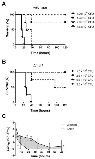 Assessment of the impact on K. pneumoniae virulence revealed a marked decrease in the survival of mice inoculated with doses of 1.8 × 107 CFU and higher of the wild-type strain. The lethal dose at which 50% of susceptible mice will die (LD50) of the wild-type strain MGH 78578 was calculated by the probit analysis to be 1.40 × 107 CFU (Figure 3A). However, the estimated LD50 of the mutant strain ΔmurI was 9.6 × 107 CFU (Figure 3B).