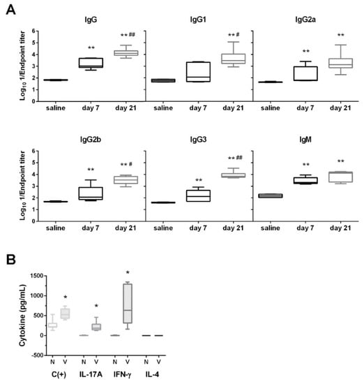 The levels of total IgG and of subclasses IgG1, IgG2a, IgG2b and IgG3, and IgM antibodies were quantified in mouse serum using a whole-bacterial cell ELISA as previously described [29]. Cytokines IL-2, IL-4 and IL-17A, and IFN-γ were evaluated in the cellular supernatant of splenocytes isolated from immunized and control mice on day 55 after the second immunization. Mouse spleens were removed aseptically and mechanically disrupted. The cell suspension was enriched for lymphocytes by a gradient centrifugation. Then, splenocytes were ex vivo restimulated with the vaccine strain and incubated at 37 °C, 5% CO2 for 48 h. The cytokine levels were measured with a commercial ELISA kit (Affymetrix) according to the manufacturer’s instructions, with minor modifications [33].