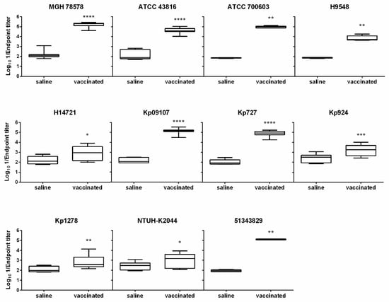 The capacity of the vaccine strain to generate a broad immune response against the parental and several unrelated Klebsiella spp. strains, including MDR or hypervirulent clones belonging to different ST and K-types, was determined (Table 1, Tables S1 and S2). Significant IgG antibody titers were detected against all heterologous K. pneumoniae strains tested (p < 0.005, Mann–Whitney U test) (Figure 5). Highly significant IgG antibody titers were detected against five of these strains (ATCC 43816, ATCC 700603, Kp09107, Kp727 and 51343829), similar to that determined against the isogenic strain MGH 78578. These data demonstrate that inoculation with the ΔmurI strain not only produces antibodies against the isogenic strain, but also induces IgG antibodies that cross-react with other unrelated K. pneumoniae and K. quasipneumoniae strains.