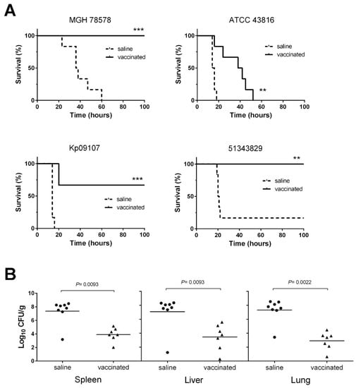 The bacterial load in different organs (spleens, livers and lungs) obtained from vaccinated mice after challenge with K. pneumoniae MGH 78578 (3.2 × 108 CFU) was significantly lower than in the control group (at least a 3-log-unit reduction; p < 0.01, log-rank test), indicating that vaccination prevented bacterial dissemination to internal organs and the spread of systemic infection (Figure 6B).