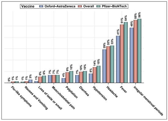 According to the Centers for Disease Control and Prevention (CDC) and the WHO, the common side effects of COVID-19 vaccines include fever, fatigue, headaches, chills, nausea, and injection site reactions []. However, some rare but serious adverse events, such as anaphylaxis, venous thromboembolic events, cerebral venous thrombosis, myocarditis or myopericarditis, Guillain–Barré syndrome, and bleeding were observed [,,,,]. Nevertheless, the most frequently reported side effects of COVID-19 vaccines were chills, fatigue, nausea, vomiting, flu-like symptoms, palpitation, eye pain, malaise, pyrexia, peripheral swelling, injection site pain, chest pain, decreased appetite, arthralgia, myalgia, headache, dizziness, tremor, dyspnea, rash, oropharyngeal discomfort, hyperhidrosis, diarrhea, abdominal pain, and cough [,,,].