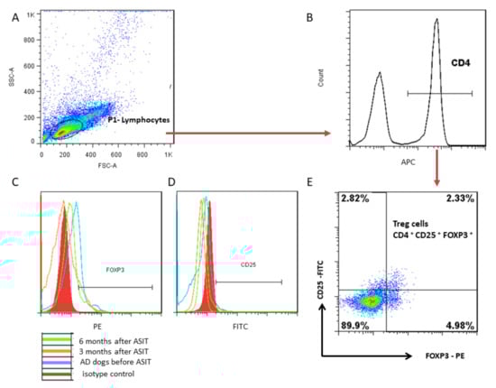 Representative plots of gating strategy for flow cytometry showing canine Treg characterization. (A) Forward-scatter area (FS) versus side-scatter area (SS) plot to delineate the lymphocyte region. (B) The CD4 population was gated among lymphocytes. (C,D) Representative histograms of CD25 and FOXP3 expression, respectively, for AD patients before ASIT and 3 and 6 months after ASIT, with isotypic control marked on the histograms. (E) CD25 versus FOXP3 plot was used to gate Treg cells (CD4+CD25+FOXP3+) among CD4+ T cells. Data were analyzed using FlowJo software.