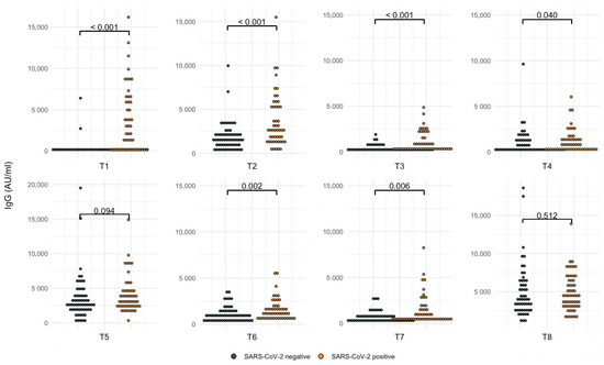 Figure 1 shows the cumulative cases according to positive or negative SARS-CoV-2 infection, n = 112. T1: 21–28 days after the first BNT162b2 dose (SARS-CoV-2 positive = 49). T2: 21–28 days after the second dose (SARS-CoV-2 positive = 50). T3: 3 months after the second dose (SARS-CoV-2 positive = 50). T4: 1–7 days after the third dose (SARS-CoV-2 positive = 52). T5: 21–28 days after the third dose (SARS-CoV-2 positive = 52), T6: 3 months after the third dose (SARS-CoV-2 positive = 52). T7: before the fourth dose (SARS-CoV-2 positive = 52). T8: 21–28 days after the fourth dose (SARS-CoV-2 positive = 58).