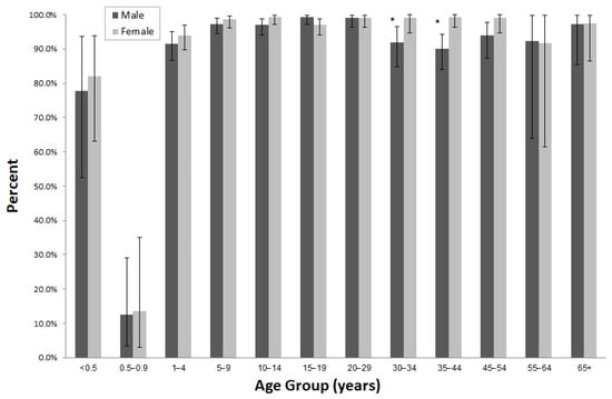 Sero-positivity for rubella by age group and gender. * p-value < 0.05.