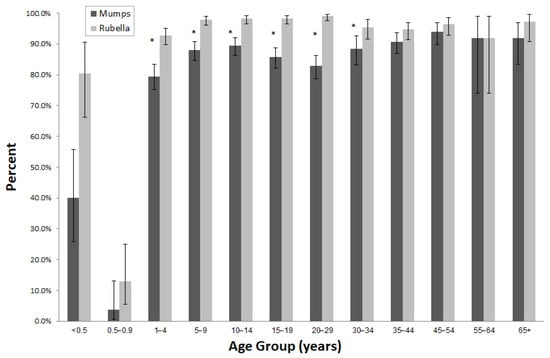 Sero-positivity against mumps and rubella by age group. * p-value < 0.05.