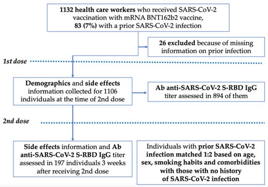 In the first phase, HCWs and hospital staff members who received the Comirnaty® vaccine from 31 December 2020 to 28 January 2021 according to the approved schedule were included. Data on previous SARS-CoV-2 infection, demographics, smoking habits, and self-reported comorbidities were collected in a structured questionnaire administered at the time of the second dose injection (21 days after the first dose). Simultaneously, side effects that developed after the first vaccine dose were collected through the same questionnaire. Subjects for whom data on the SARS-CoV-2 prior infection were not available were later eliminated from the study population. Analyses were conducted in the overall included population and after stratification according to prior SARS-CoV-2 infection status. In a subgroup of patients who consented to blood sampling, we assessed plasma levels of class G immunoglobulins (IgG) directed toward the SARS-CoV-2 receptor-binding domain (RBD).