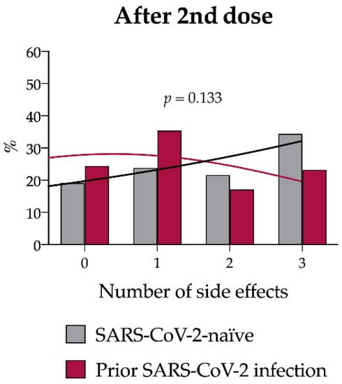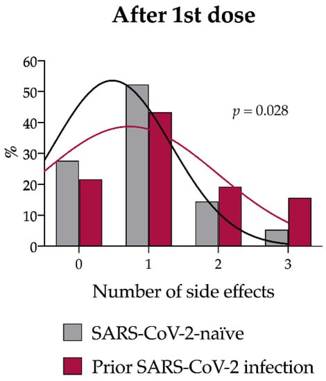 To address the influence of prior SARS-CoV-2 infection on vaccination-related side effects, we compared the number and type of solicited side effects in individuals with a RT-PCR-confirmed prior SARS-CoV-2 infection and SARS-CoV-2-naïve subjects. After the first dose, subjects with a previous SARS-CoV-2 infection reported to have experienced side effects more frequently than SARS-CoV-2 naïve subjects (18/83, 21.7% vs. 336/1023, 32.8%, p = 0.038). In addition, individuals with a history of SARS-CoV-2 infection more frequently reported the co-occurrence of two (16/83, 19.3%) or three or more (13/83, 15.7%) side effects than SARS-CoV-2 naïve subjects, who had more frequently one (465/1023, 45.5%) or no (336/1023, 32.8%) side effects (p = 0.021). Regarding side effect type, subjects with a prior SARS-CoV-2 infection more often reported pain at the injection site (75.9% vs. 62.7%, p = 0.016), weakness (22.9% vs. 9.3% p < 0.001) (Supplementary Table S1), and fever (9.6% vs. 2.5% p < 0.001) than subjects without a prior SARS-CoV-2 infection (Table 2).