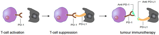 T cell activation is suppressed by the interaction between programmed death 1 (PD-1) on T cells and PD-L1 on tumour cells. Antibody drugs for cancer immunotherapy bind to PD-1 or PD-L1, blocking the PD-1/PD-L1 interaction.