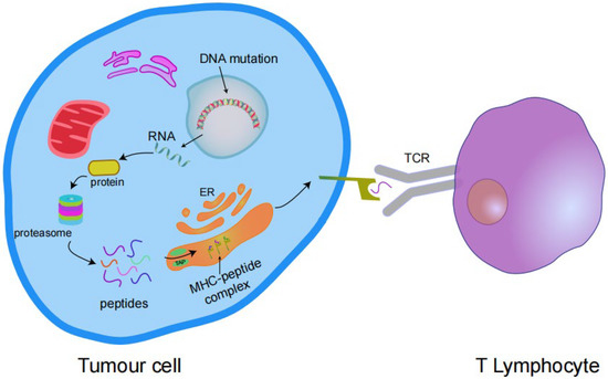 Transcription of mutant genes results in the expression of antigenic proteins that are processed by the proteasome into peptides and enter the endoplasmic reticulum (ER) via transporters associated with antigen processing (TAP) complexes. These peptides bind to the MHC I complex and are expressed on the cell surface and then bind to the T cell receptor (TCR) to activate T cells.