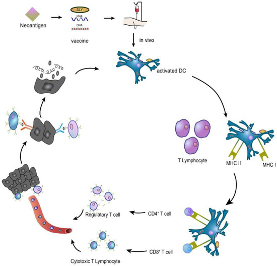 The principle of tumour vaccine therapy is to introduce tumour antigens into patients in the form of tumour cells, tumour-associated proteins or peptides, and genes expressing tumour antigens to overcome tumour-induced immunosuppression and enhance immunogenicity as a method to activate the patient’s own immune system and induce cellular and humoral immune responses that control and eliminate tumours [50,51]. For example, in an HNSCC preclinical study of a syngeneic mouse oral cancer cell line, a combination of NGS data and an electronic analysis detected neoantigen candidates. Validation of candidate vaccines showed that prophylactic vaccination with SLP derived from the mutant ICAM1 neoantigen induced significant T cell responses and significant tumour suppression. Given the relatively high tumour mutation burden (TMB) of HNSCC, cancer vaccine therapy with neoantigen-derived SLPs is a promising approach for HNSCC treatment [52,53]. The neoantigen vaccine mechanism is shown in Figure 5.