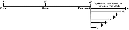DBA/2J mice (females, 6 to 8 weeks old) were purchased from the Jackson Laboratory (Bar Harbor, ME). The mice were housed in microisolator units and fed ad libitum. Mice were randomly divided into 16 groups (6 animals/group) and vaccinated IM or IP with a combination of 3 μg/Ag of COBRA Y2 (H1N1) and COBRA NG2 (H3N2) rHAs [], expressed and purified as previously described []. All vaccinations, with the exception of the final boost, were formulated with an emulsified squalene-based oil-in-water emulsion adjuvant, AddaVax (InvivoGen, San Diego, CA, USA), and the final concentration after mixing 1:1 with rHA was 2.5% squalene in a total volume of 50 μL. The final boost was composed by the same quantity of COBRA rHAs resuspended in phosphate-buffered saline (PBS, Corning, Tewksbury, MA, USA) only. Vaccines were administered into the hind leg of the animals (for the IM immunization) or in the peritoneal cavity (for the IP immunization) on days 0, 21 and 42 in a homologous prime-boost-boost regimen. Blood was terminally collected from the facial vein at the day of the sacrifice after the final boost, specifically at day 3, 5, 6, 7, 8, 9, 12 and 14 after the final boost (Figure 1). Serum was isolated from the blood by centrifugation at 2500 rpm for 10 min. Clarified serum was removed and frozen at −20 ± 5 °C until usage. Spleens were also collected at the day of the sacrifice after the final boost (at day 3, 5, 6, 7, 8, 9, 12 and 14) and homogenized using a gentleMACS™ dissociator (Miltenyi Biotec, Bergisch Gladbach, Germany). Homogenized spleens were then washed with B-cell medium (BCM) composed by: RPMI 1640, 10% fetal bovine serum (FBS), 2 mM L-glutamine, 100 U/mL penicillin, 100 μg/mL streptomycin, 8 mM HEPES, 23.8 mM sodium bicarbonate, essential and nonessential amino acids, 1 mM sodium pyruvate and 50 μM 2-mercaptoethanol. All components of the BCM were purchased from Thermo Fisher Scientific (Waltham, MA, USA) with the exception of the FBS that was purchased from Atlanta Biologicals, Flowery Branch, GA, USA. Cells were then pelleted at 400× g for 7 min, resuspended in a solution of 90% FBS and 10% dimethyl sulfoxide (DMSO, Sigma-Aldrich, Darmstadt, Germany) and stored frozen in liquid nitrogen until usage. For the FluoroSpot assay (Section 2.4), splenocytes were thawed at 37 °C in a water bath, washed and resuspended in BCM and counted using a LUNA-II automated cell counter (Aligned Genetics, Inc., Anyang, South Korea). A splenocyte viability of ~90% was normally achieved following the above procedure.