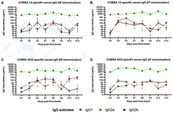 Binding assays performed in ELISA using sera collected following the final boost of mice revealed that the COBRA Y2 and NG2 Ag-specific polyclonal antibody responses are mainly composed by IgG1 antibodies at all the tested time points (3–14 days following the final boost). This predominant IgG1 antibody response is observed both in IM- and IP-vaccinated mice with an average 1–7.5 and 2.5–10 mg/mL of serum IgG1 equivalents against COBRA Y2, and of 1–4 and 1.5–6 mg/mL against COBRA NG2, respectively (Figure 2). Additionally, this IgG1 antibody response follows a stable and constant trend, characterized by some minor but statistically significant (p < 0.05) Ag-specific IgG1 peaks across all the time points (Figure 2 and Supplementary Materials). On the other end the COBRA Y2- and NG2-specific IgG2a and IgG2b antibody response is of lower magnitude both in IM- and IP-vaccinated mice with an average 20–100 and 20–175 μg/mL of serum IgG2a and IgG2b equivalents against COBRA Y2, and of 10–150 and 10–100 μg/mL against COBRA NG2, respectively. Differently from the IgG1 serum antibody response, the Ag-specific IgG2a and IgG2b is of lower magnitude, and the observed variability across the different time points could be attributed to the internal assay variability, considering the absence of a statistically significant difference (p > 0.05) of the IgG2a and IgG2b values across all the time points. A synopsis of the statistical analysis comparing the IgG1, IgG2a and IgG2b antibody subclass titers across the different time points is reported in the Supplementary Materials.