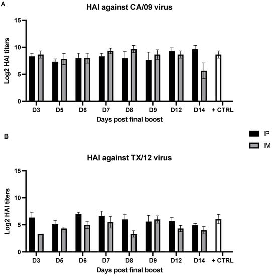 HAI from sera collected at different time points following the final boost of mice that were IP- or IM-immunized with the combination of COBRA Y2 and NG2 rHAs. The H1N1 A/California/07/2009 (CA/09) (A) and the H3N2 A/Texas/50/2012 (TX/12) (B) were used as representative virus strains to detect the HAI activity following the immunization with the COBRA Y2 and NG2 rHAs. Shown results are expressed as absolute mean values plus SEM (error bars) using the different mouse group sera. The limit of detection of the assay corresponds to a serum dilution of 1:10. Absence of statistically significant differences (p > 0.05) among the HAI titers of the sera collected at different time points against the CA/09 and TX/12 strains within the analyzed day 3–14-time frame was determined as specified in the Materials and Methods section.