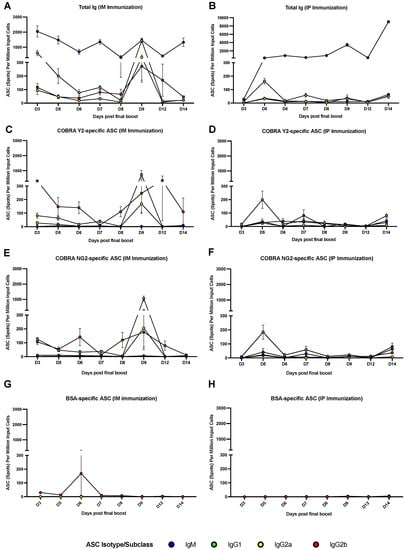 Enumeration of total (A,B), COBRA Y2 and NG2 Ag-specific ASCs (C–F) from splenocytes collected at different time points following the final boost of mice that were IP- or IM-immunized with the combination of COBRA Y2 and NG2 rHAs. BSA was used as an irrelevant antigen for ASC background reactivity purposes (G,H). Shown results are expressed as absolute mean values plus SEM (error bars) using the different mouse group splenocytes. The limit of detection of the assay is 1/100,000 cells (spots). A synopsis of the statistical analysis comparing the magnitude of the IgM and IgG1, IgG2a, IgG2b antibody subclass ASCs across the different time points is reported in the Supplementary Materials.