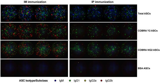 Representative FluoroSpot wells acquired from a 96-well plate for total (1.25 × 104 splenocytes input/well), COBRA Y2 (7.5 × 104 splenocytes input/well), COBRA NG2 (7.5 × 104 splenocytes input/well) and BSA (3 × 105 splenocytes input/well) ASCs from splenocytes collected following the final vaccine boost of mice through IM (left panels) or the IP (right panels) route using the combination of COBRA Y2 and NG2 rHAs. Represented wells were obtained from splenocytes collected at day 9 (for the IM-immunized group) and at day 5 (for the IP-immunized group) from one representative animal and run as quadruplicates.