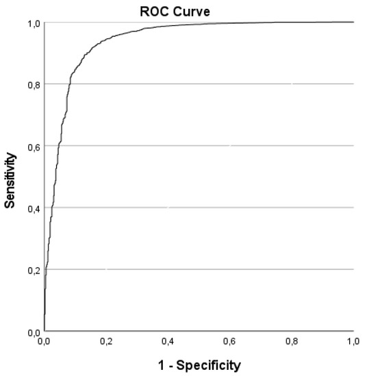 The effect strength of the multivariate binary logistic regression model amounts showed f2 = 0.59 and indicates a strong effect on students’ COVID-19 vaccination status. The overall correct classification rate was 95.5%. For the calculation of the receiver operating characteristics (ROC) curve, n = 5841 cases with positive COVID-19 vaccination status and n = 538 cases with negative COVID-19 vaccination status were included; n = 177 cases (2.7%) were excluded that showed a missing value for at least one variable of the model. Figure 1 shows the ROC curve; the AUC measures 0.939. The overall model has a very good model fit with an AUC close to perfect accuracy.
