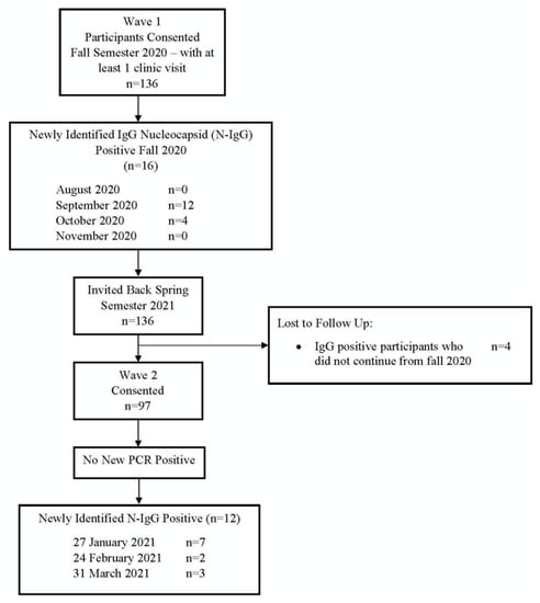 Figure 1 displays enrollment in fall 2020 and spring 2021. Sixteen participants were N-IgG positive during September–October 2020 and 12 were positive during January (n = 7), February (n = 2), and March (n = 3), 2021.