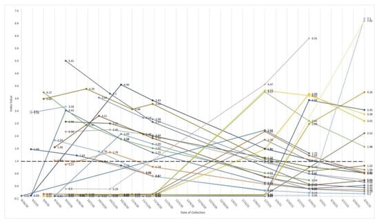 Change in quantity of antiN-IgG for 28 young adults with at least one N-IgG positive result, 26 August 2020–31 March 2021. Each individual is represented by a colored line from first testing date to last testing date. Number at dot is index value. An index value greater than or equal to (≥) 1.4 is positive (bold dotted line). The chemiluminescent microparticle immunoassay (CMIA) captures antibodies reactive with the Nucleocapsid (N) protein and specifically detects IgG only. This qualitative assay reports a ratio of luminescence between sample and calibrator (the S/C index) (Abbott Architect i2000 2). One N-IgG positive participant enrolled and withdrew in September (2 data points); one participant had one study visit in September 2020 (1 data point). Three participants tested positive at last study visit date (1 data point). The remaining 23 provided N-IgG measures across multiple weeks.