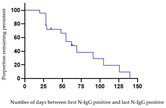 Figure 3 displays the number of days from the initial N-IgG positive to the last measure of N-IgG positive (column 3 from Table 1, “IgG persistence”) for 22 students. At 140 days (~4.7 months), 68.1% (15/22) of participants had lost persistent N-IgG status (below 1.4 S/C threshold) by 31 March 2021. The mean (SD) and median number of days were 77.8 (9.9) and 62, respectively, with interquartile estimates between 29 days to 105 days. One participant was lost to follow-up in September 2020 and excluded from Figure 3 (remained in Table 1).