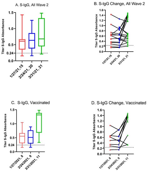 Eleven had obtained at least one dose of vaccine and two students had obtained two doses of vaccine. Figure 4 displays the box and whisker plots (Figure 4A,C) and line graphs (Figure 4B,D) for the Wave 2 S-IgG subgroup (Figure 4A,B) and the vaccinated (Figure 4C,D) among this sub-group, respectively. The mean S-IgG titers were not significantly different between 27 January and 24 February (p = 0.82) (Table S2). On 31 March 2021 among the vaccinated (n = 11), the mean S-IgG titer was 1.098 compared to 0.5603 among the unvaccinated (n = 10) (p = 0.003). One student was first vaccinated on 27 January 2021 and completed the second dose three weeks later. Ten students received their first vaccine dose after 2 March 2021 (see Figure S2). Two students received one dose of the Janssen vaccine and the remaining students received mRNA Pfizer/BioNTech.