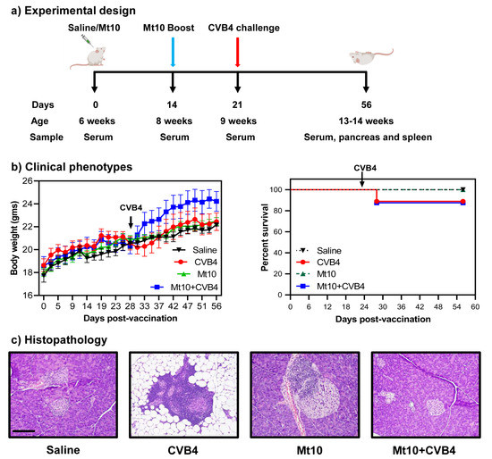 Mt10 vaccinated mice are protected from type 1 diabetes in challenge studies. (a) Experimental design. Groups of mice were given saline or were vaccinated with the Mt10 vaccine on days 0 and 14. After 7 days, CVB4 was administered to one group from each treatment. Experiments were terminated on day 56, and tissues were collected for histologic analysis. Serum was collected on days 0, 14, 21, and day 56 at termination. (b) Clinical phenotypes. Body weights (left panel) and survival rates (right panel) of different groups are shown. Generalized least square model was used to compare body weight changes in the saline, vaccine, and vaccine/challenged groups relative to the CVB4 group; log-rank test with Bonferroni correction was used to compare survival curves. (c) Histopathology. Pancreata preserved in 10% phosphate buffered formalin from the indicated groups were processed routinely and H. and E.-stained sections were evaluated for insulitis and other changes. Representative pancreatic sections are shown. Sections from the CVB4 group show destruction of islets of Langerhans and fatty tissue replacement whereas the samples from the saline and Mt10/CVB4-challenged groups shown are essentially normal. The Mt10 sample shows peri-insulitis and insulitis. Magnification, 20×; scale bar = 100 µm, applies to all panels. Data obtained from each group involve 5–10 mice.