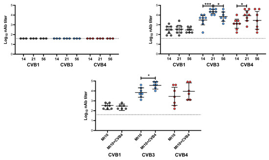 Mt10 vaccine induces nAbs against CVB4. Sera were collected from recipients of saline (top left), Mt10, (top right) and Mt10 + CVB4 (bottom) on days 14, 21, and 56. Two-fold serial dilutions from 1:40 up to 1:40,960 were made, and samples were incubated with CVB1, CVB3, or CVB4. The mixtures were later transferred to plates containing monolayers of LLC-MK2 cells for CVB1 or Vero cells for CVB3 and CVB4 and incubated for 4 days to calculate the percentage neutralization based on CPE. The top left panel indicates the nAb titers determined against CVB1, CVB3, and CVB4 in the saline group that served as a baseline. The top right panel indicates the nAbs determined in the Mt10 vaccine group against CVB1, CVB3, and CVB4 at three different time points, and the profiles were compared. The bottom panel indicates the nAb titers determined in the Mt10 vaccinated/CVB4 challenged group and the profiles were compared with those of Mt10 vaccine group at termination (day 56). Data from n = 3–8 samples are shown. Two-way ANOVA with Sidak’s post-test was used to compare significance of nAb titers. * p ≤ 0.05, *** p ≤ 0.001.