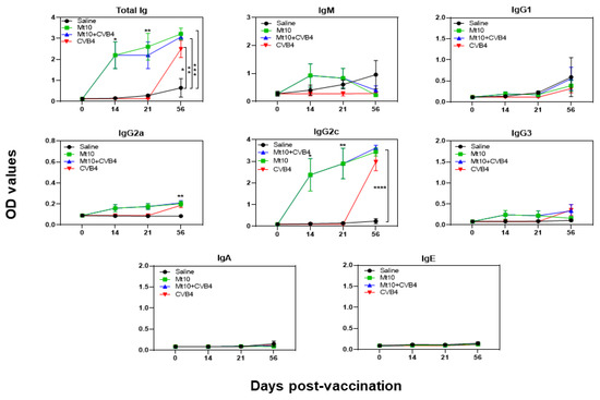Serum samples from various groups (saline, Mt10 alone, CVB4 alone, Mt10 + CVB4) were collected on days 0, 14, 21 and 56, and analyzed for total immunoglobulins (Ig), IgM, IgG1, IgG2a, IgG2c, IgG3, IgA, and IgE as described previously [33]. Full-length CVB3 viral protein 1 (VP1) (GenScript, Piscataway, NJ, USA) and keyhole limpet hemocyanin (KLH) protein (Sigma-Aldrich, St. Louis, MO, USA) were procured commercially. Briefly, 96-well polystyrene microtiter plates were coated with or without CVB3 VP1 or an irrelevant control (KLH) (5 μg/mL) in 1× coating buffer and incubated at 4 °C overnight. The next day, plates were washed with a buffer (0.05% Tween®20 in 1× PBS) and blocked with an assay buffer (2% bovine serum albumin (BSA) and 5% normal goat serum in 1× PBS) for 1.5 h at room temperature (RT); serum samples prediluted in assay buffer (1:150) were then added to the plates in duplicates. After incubating at 37 °C for 1 h, plates were washed. For secondary antibodies, horseradish peroxidase (HRP)-labeled goat anti-mouse Ig, IgM, IgG1, IgG2a, IgG2c, IgG3, IgA, and IgE (Southern Biotech, Birmingham, AL, USA) were diluted in assay buffer (1:500) and plates were incubated at RT for 2 h, following which 100 µL of 1× tetramethylbenzidine solution (Rockland, Philadelphia, PA, USA) was added as substrate, and reactions were stopped using equal volumes of 1 M phosphoric acid. Plates were read at 450 nm using an automated enzyme-linked immunosorbent assay (ELISA) plate reader (BioTek Instruments, Winooski, VT, USA), and optical density (OD) values were measured.