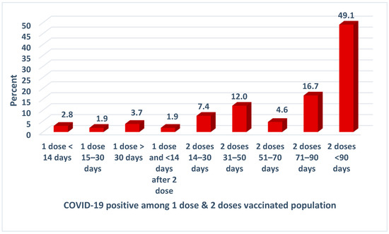 Figure 2 shows that, out of a total of 98 individuals who received the vaccine and tested SARS-CoV-2 positive, 2 (1.9%) tested positive within 14 days of the first dose, while 3 (2.8%) tested positive between 15 and 30 days after the first dose. Another 2.8% tested positive within 14 days of receiving the second dose. It is seen that nearly half of the fully vaccinated participants (48.1%) tested positive after 90 days following the second dose, while only 15.7% tested positive within 31–60 days of receiving the second dose, and 17.6% were infected between 61–90 days.