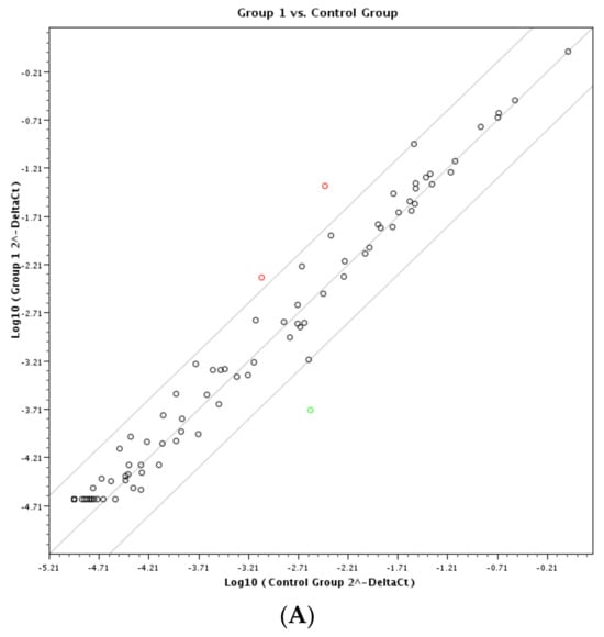 The RT2 Profiler Array Chicken Innate and Adaptive Immune Responses system (Qiagen) was used to quantify changes in RNA transcripts in a 96-well format on a Stratagene Model Mx3005P unit (Agilent Technologies, Santa Clara, CA, USA). The RT2 Profiler PCR Array system is a fully validated pathway-focused panel of laboratory-verified qPCR assays with integrated, patented controls to enable quick, reliable gene expression analysis. The array contains a panel of 84 immune-related genes from the innate (Pattern Recognition Receptors, Cytokines, Other), adaptive (Th1, Th2, Th17, and Treg markers, T Cell Activation, Cytokines, Other), humoral, and inflammatory responses, as well as the defense response to bacteria and viruses. Nucleic acid extraction, reverse transcription, normalization with housekeeping genes, and data analysis were carried out according to fully validated protocols and Excel macros supplied by the manufacturers of the PCR Array System. Reproducibility was ensured by running samples in triplicates and pooling samples for RT-PCR array. This array system demonstrated strong correlations across technical replicates, lots, and instruments with average correlation coefficients >0.99, ensuring reliable detection of differences in expression between biological samples (Qiagen, Hilden, Germany).