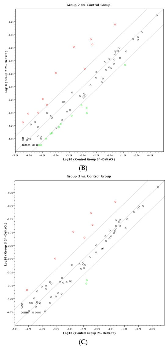 Changes in chicken macrophage gene expression following poly(I:C) treatment. Cultures of HD-11 chicken macrophages were transfected and incubated for 12 h with 250 ng/mL of control reagents, Control; LMW poly(I:C), group 1; HMW poly(I:C), group 2; or a mixture of LMW + HMW poly(I:C), group 3. Following extraction of mRNA from lysed cells, changes in the expression of 84 different cytokine and cytokine receptor genes were evaluated using the Qiagen RT2 RT-PCR gene array system. Changes in gene expression relative to control are presented for LMW poly(I:C) (A), HMW poly(I:C) (B), and LMW + HMW poly(I:C) (C). A minimum of a 4-fold change in gene expression is regarded as significant. In Figure (A–C), upregulated genes are indicated as open green circles. The further away the circle is from the outer boundary lines, the higher the fold change in the upregulated genes. Downregulated transcripts are shown as open red circles while upregulated genes are shown as open green circles.