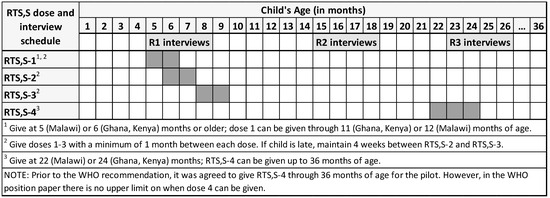 - Asante, K.P.; Mathanga, D.P.; Milligan, P.; Akech, S.; Oduro, A.; Mwapasa, V.; Moore, K.A.; Kwambai, T.K.; Hamel, M.J.; Gyan, T.; et al. Feasibility, Safety, and Impact of the RTS, S/AS01E Malaria Vaccine when Implemented through National Immunisation Programmes: Evaluation of Cluster-Randomized Introduction of the Vaccine in Ghana, Kenya and Malawi. Lancet 2023, in press.