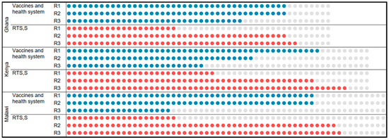 Partly due to an increased focus on RTS,S in the R2 and R3 interviews, the trajectory of trust in RTS,S was striking in its consistency within and across countries. Text Box 1 exemplifies the trajectory in an individual caregiver and Figure 3 displays the pattern in the samples from each country. Each representing an individual, the blue dots in Figure 3 signify that the caregiver expressed general vaccine trust one or more times during the interview (e.g., R1 in Text Box 1); red dots signify expressions of specific trust in the new malaria vaccine (e.g., R2 and R3 in Text Box 1). Rather than a shift from general to specific trust, these findings reveal instead a dynamic linkage between the two. While foundational trust in vaccines/the system enabled initial acceptance, even with trepidation (R1), the observed safety and benefits of RTS,S over time (R2 and R3) lead to its inclusion within the broader family of trusted childhood immunizations. (Supplementary File S6: additional exemplification of RTS,S trust trajectory).