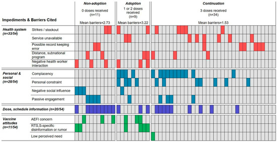 Figure 4 displays the barriers contributing to 54 children receiving zero or fewer-than-four RTS,S doses by R3. Each column in the figure represents one individual. Colored cells going down the column indicate barriers (listed in column 1) coded to that individual’s data. Gray cells indicate that no barriers were coded.