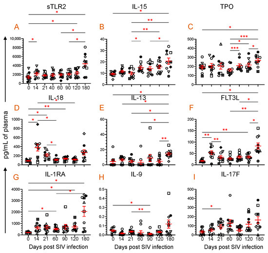 Plasma sTLR2 and eight cytokine profiles during SIV infection. Scattered plots with mean ± SE for (A) sTLR2 and eight different cytokines ((B), IL-15; (C), TPO; (D), IL-18; (E), IL-13; (F), FLT3L; (G), IL-1RA; (H), IL-9; and (I), IL-17F) responses observed throughout the SIV infection time points are shown. Each symbol on the scattered plot represents the cytokine concentration for an individual macaque. The red line with bars represents mean ± SE for each time point. Asterisks indicate statistical differences between time points as calculated by Tukey’s multiple comparison analysis (*, p ≤ 0.05; **, p ≤ 0.01; ***, p ≤ 0.001).