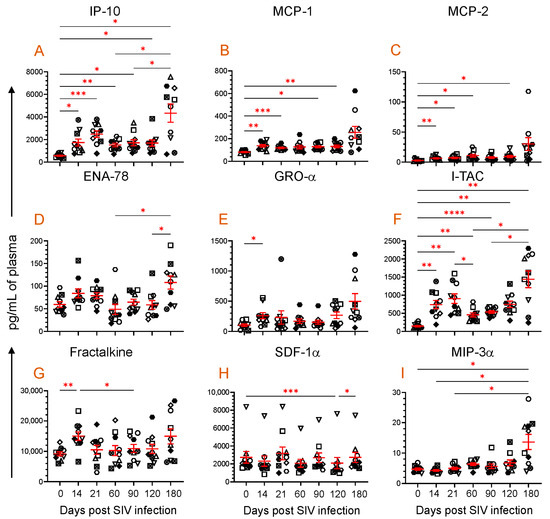 Plasma chemokine profile during SIV infection. Scattered plots with mean ± SE for nine different chemokines ((A), IP-10; (B), MCP-1; (C), MCP-2; (D), ENA-78; (E), GRO-α; (F), I-TAC; (G), Fractalkine; (H), SDF-1α; and (I), MIP-3α) responses observed throughout the SIV infection time points are shown. Each symbol of the scattered plot represents the chemokine concentration for an individual macaque. The red line with bars represents mean ± SE for each time point. Asterisks indicate statistical differences between time points as calculated by Tukey’s multiple comparison analysis (*, p ≤ 0.05; **, p ≤ 0.01; ***, p ≤ 0.001; ****, p ≤ 0.0001).