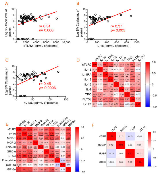 Correlation analysis among plasma viral load, cytokines, chemokines, and inflammatory markers. (A–C) Significant positive correlations between plasma viral loads and sTLR, IL-18, or FLT3L were detected. Correlation matrix of sTLR2 and cytokines (D) and sTRL2 and chemokines (E) at D0, 14, 21, 60, 90, 120, and 180 post-SIV infection time points in SIV-infected macaques. (F) Correlation matrix of sTLR2 and inflammatory markers (REG3A, I-FABP, and sCD14) at D0, 14, 21, 60, 90, 120, and 180 post-SIV infection time points in SIV infected macaques. Two-tailed Pearson correlation values (r) are shown from red (1.0, positive correlation) to blue (–1.0, negative correlation). In each box, r values indicate positive and negative correlations by number and color. Asterisks show significant differences (*, p ≤ 0.05; **, p ≤ 0.01; ***, p ≤ 0.001; ****, p ≤ 0.0001).