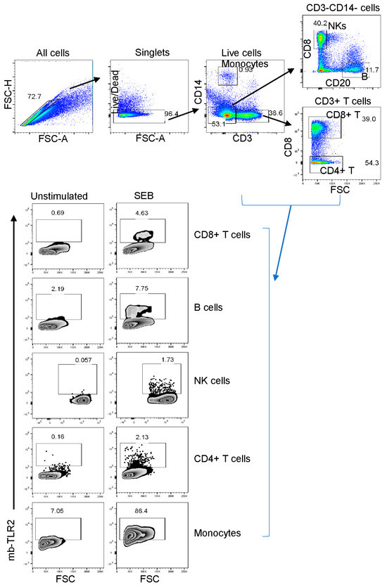 The TLR2 expression of various cell subsets in a representative macaque’s peripheral blood mononuclear cells was detected using flow cytometry before infection. First, the cells were gated to identify singlets and then live cells. After that, CD3+ or CD14+ monocytes were identified. The CD3–CD14– cells were then gated further to identify B cells and NK (CD3–CD14–CD20–CD8+) cells based on their CD8 and CD20 expression. CD3+CD8– T cells were defined as CD4+ T cells in this study. The study evaluated the TLR2 expression of various cell subpopulations, showing the percentage of each boxed-gated cell population for unstimulated media control and Staphylococcus enterotoxins B (SEB) stimulated cells. It’s important to note that SEB causes cell activation and increases the presence of mb-TLR2-positive cells in the culture.