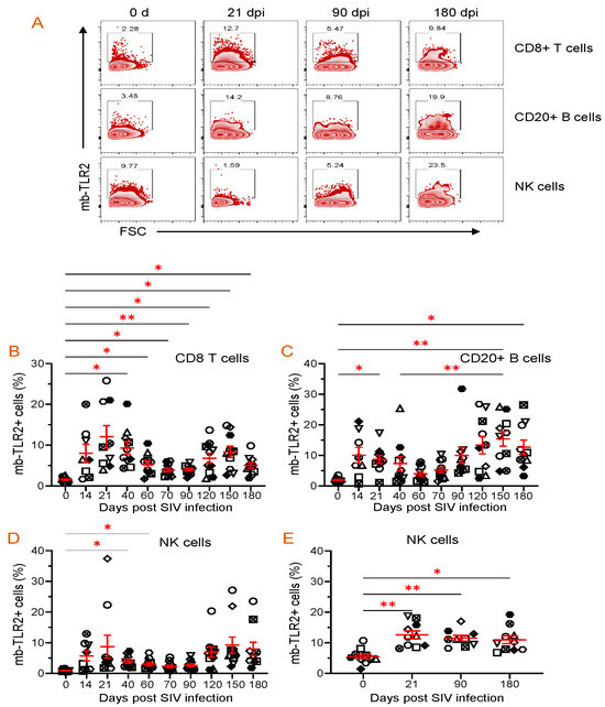 Dynamics of mb-TLR2 expression of different cell subsets during SIV infection in PBMC and jejunum lamina propria lymphocytes. (A) Representative expression of mb-TLR2 in PBMC from a macaque at different time points after SIV infection. Percentages of mb-TLR2+ cells in either CD8+ T cells, CD20+ B cells, or NK cells are shown in the box of each zebra plot. The frequency of mb-TLR2+ cells in (B) CD8+ T cells, (C) CD20+ B cells, and (D) NK cells in PBMC is shown for SIV-infected macaques over the infection time points. (E) Jejunum lamina propria mb-TLR2+ NK cells also significantly increased following SIV infection. Red lines with errors show mean ± SE for each time point. Each symbol on the scattered plot represents the percentage of mb-TLR2+ cells for an individual macaque. Asterisks indicate statistical differences between time points calculated by Tukey’s multiple comparison analysis (*, p ≤ 0.05; **, p ≤ 0.01).