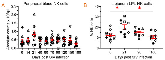 Dynamics of NK population during SIV infection in peripheral blood and jejunum lamina propria lymphocytes. (A) Absolute count of NK cells in peripheral blood and (B) frequency of NK cells in jejunum lamina propria lymphocytes are shown for SIV-infected animals over time (n = 10). Red lines with errors show mean ± SE for each time point. Each symbol on the scattered plot represents the frequency of NK cells for an individual macaque. Asterisks indicate statistical differences between time points calculated by Tukey’s multiple comparison analysis (*, p ≤ 0.05).