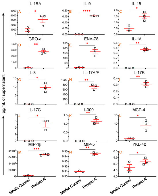mb-TLR2-mediated cytokine and chemokine regulation. IL-1RA (A), IL-9 (B), IL-15 (C), GRO-α (D), and ENA-78 (E) concentrations were detected in the cell culture supernatant with and without Protein A stimulation. An additional 10 different cytokines and chemokines ((F), IL-1A; (G), IL-8; (H), IL-17A/F; (I), IL-17B; (J), IL-17C; (K), I-309; (L), MCP-4; (M), MIP-1β; (N), MIP-5, and (O), YKL-40) were also significantly increased in the cell culture supernatant after Protein A stimulation compared to unstimulated controls. Red lines with errors show mean ± SE for each time point. The asterisks indicate significant differences between media control and Protein A-stimulated wells (n = 3) as calculated by paired t-test analysis (*, p ≤ 0.05; **, p ≤ 0.01; ***, p ≤ 0.001; ****, p ≤ 0.0001). The circle and rectangle symbols represent media control and protein A-stimulated cultures respectively.